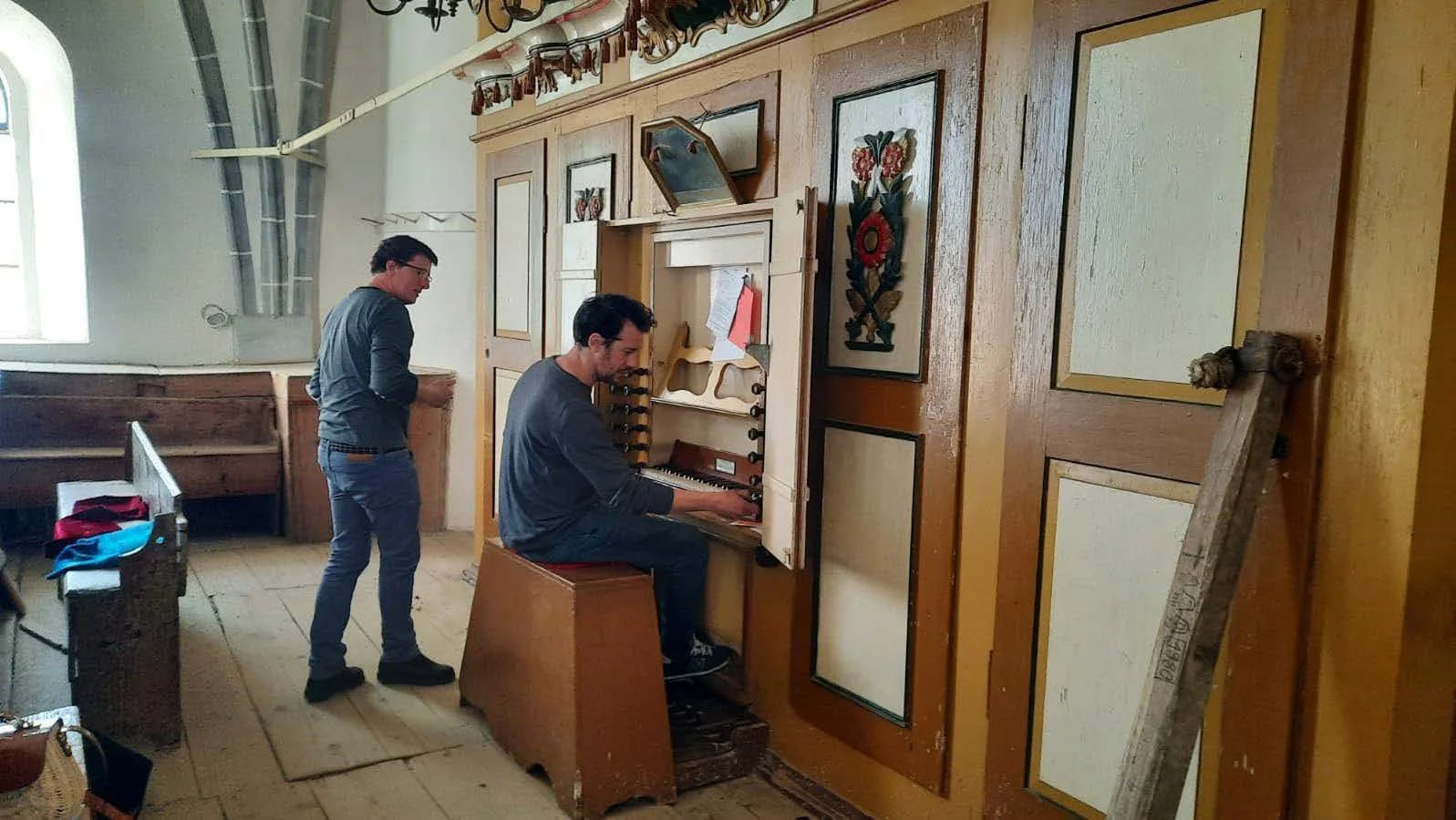 Mathe, pittore decoratore, ha ornato la superficie lignea con motivi floreali tradizionali sassoni, richiamando l’estetica locale e la memoria collettiva della comunità.